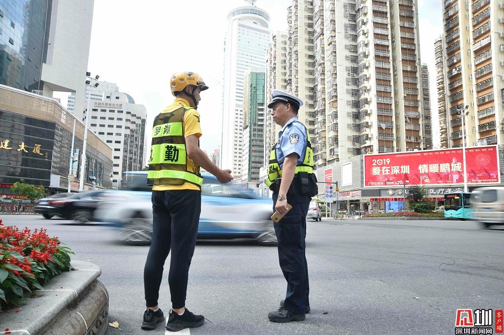 2019年4月23日,深南東路,深圳交警開展和外賣小哥角色互換的活動,美團(tuán)外賣小哥趙春曉正在路口執(zhí)勤。