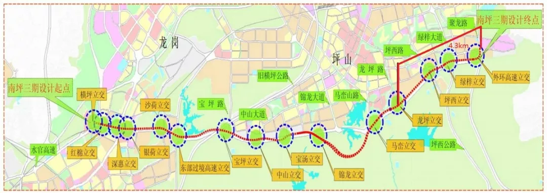 南坪三期位于龍崗區(qū)及坪山區(qū)。道路西起水官高速公路橫坪立交,東至聚龍路(規(guī)劃外環(huán)高速公路田頭立交),全長約22.2km,沿線與多條主要道路相交。