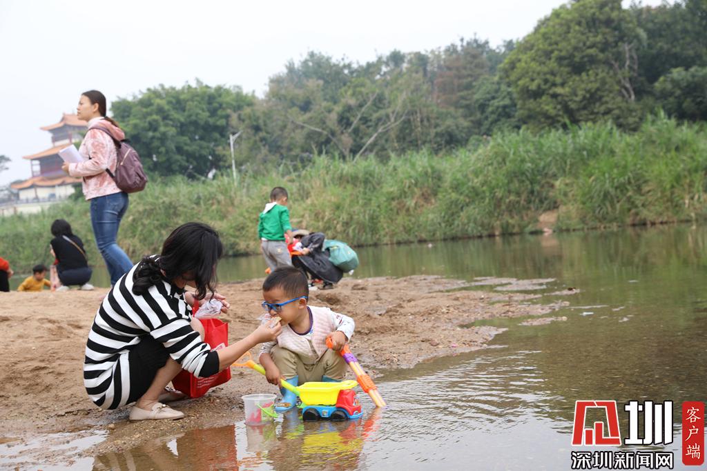 許多家長(zhǎng)帶著孩子到河邊游玩。