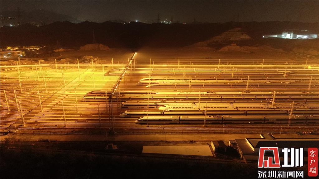 1月15日凌晨,深圳動(dòng)車運(yùn)用所內(nèi)的存車庫(kù)航拍畫面。