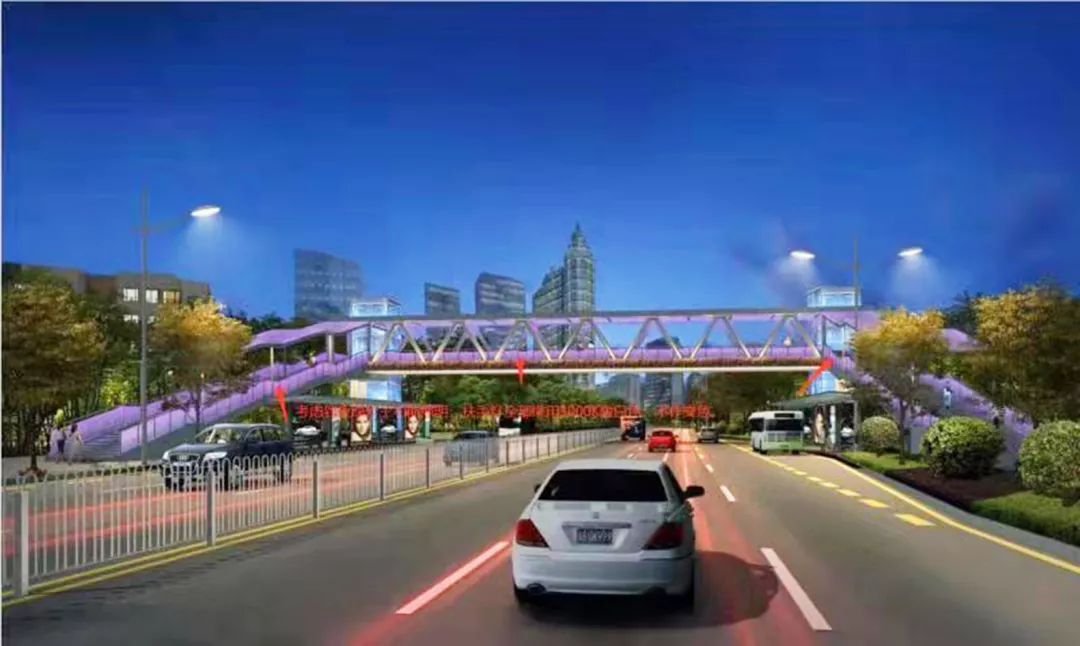 東濱路黨校人行天橋位于東濱路黨校公交車站旁,主跨結構采用下承式連續(xù)鋼桁架,主橋長46.95米,總寬5.25米,兩側梯道寬 4.5 米,兩側梯道均為單向設置,在主橋端部設置了兩部電梯。