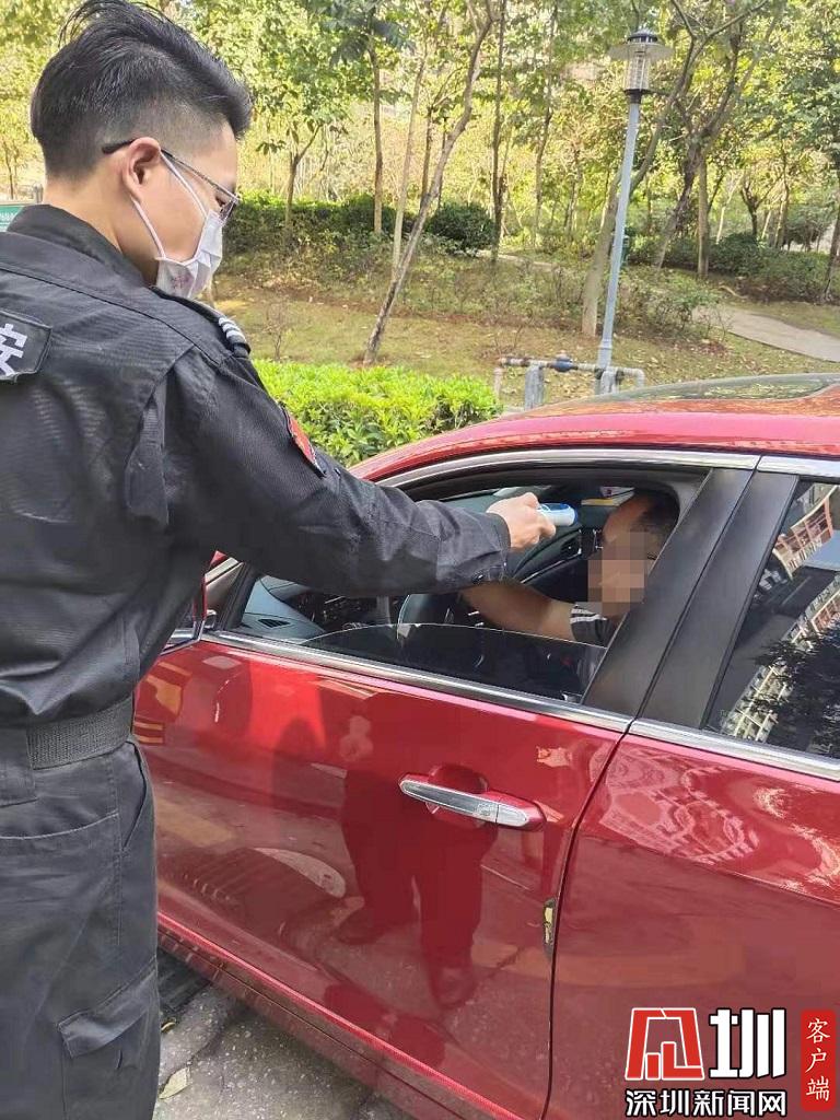 保安對進出小區(qū)車主進行體溫測量。