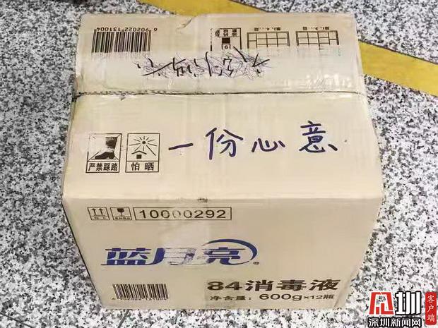 2020年1月30日晚20:55分,深圳地鐵梅村站工作人員正在安檢口執(zhí)勤時,一名戴著口罩的男子走進來,放下一個箱子便轉(zhuǎn)身離去。工作人員發(fā)現(xiàn)箱子上寫著“一份心意”四個字,打開發(fā)現(xiàn)箱內(nèi)有12瓶84消毒液,正欲上前感謝時,男子已匆匆離開,只留下了一個背影。