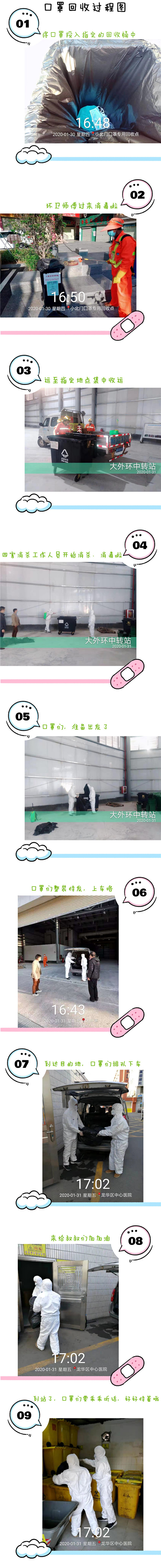 據(jù)了解,廢棄口罩每天由環(huán)衛(wèi)服務公司定時收集運送至街道回收站,再由消殺公司工作人員著防護服現(xiàn)場消毒后統(tǒng)一運送到龍華區(qū)中心醫(yī)院進行統(tǒng)一專業(yè)化銷毀處理(詳細流程見下圖)。整個處理流程福城街道市政管理服務中心嚴格把控,每天安排專人進行現(xiàn)場督促處理,堅決防止廢棄口罩因處理不當引起的二次污染。