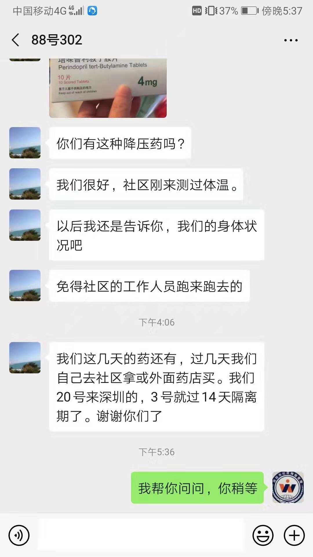 社區(qū)網(wǎng)格員與居家隔離人員“一對一”微信服務,提供幫助。