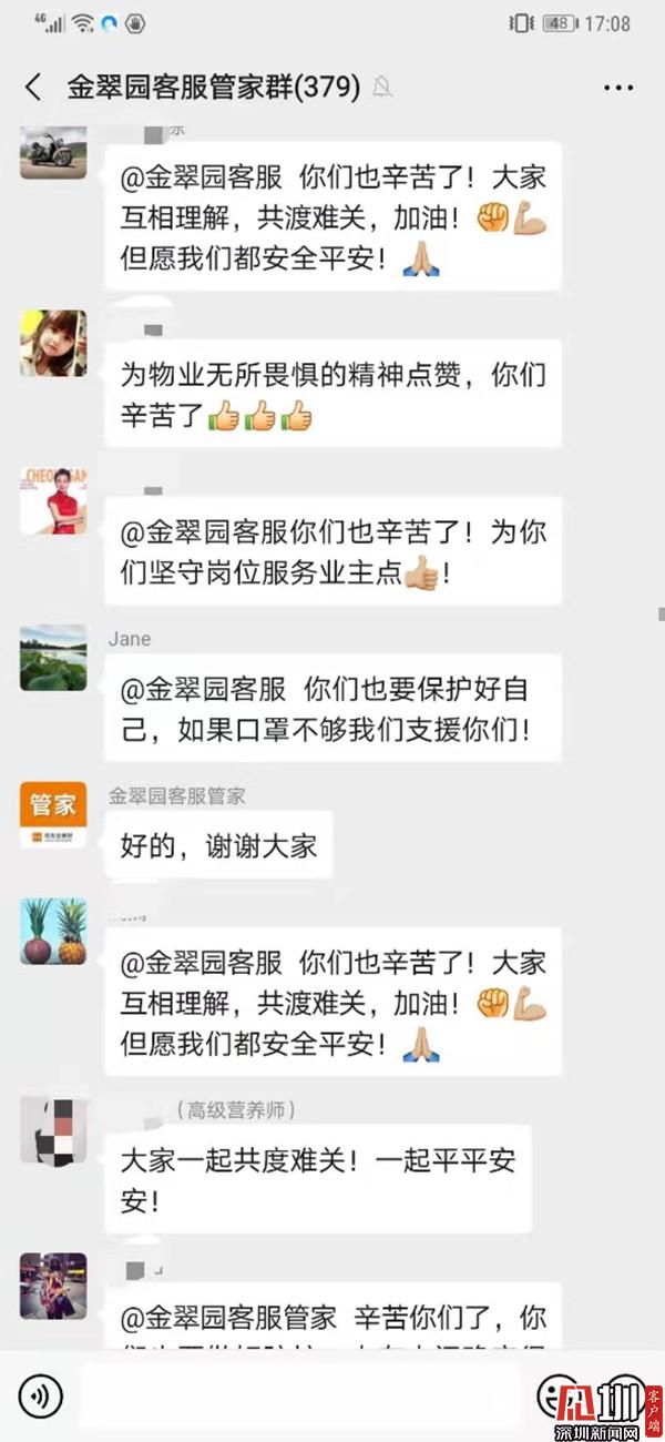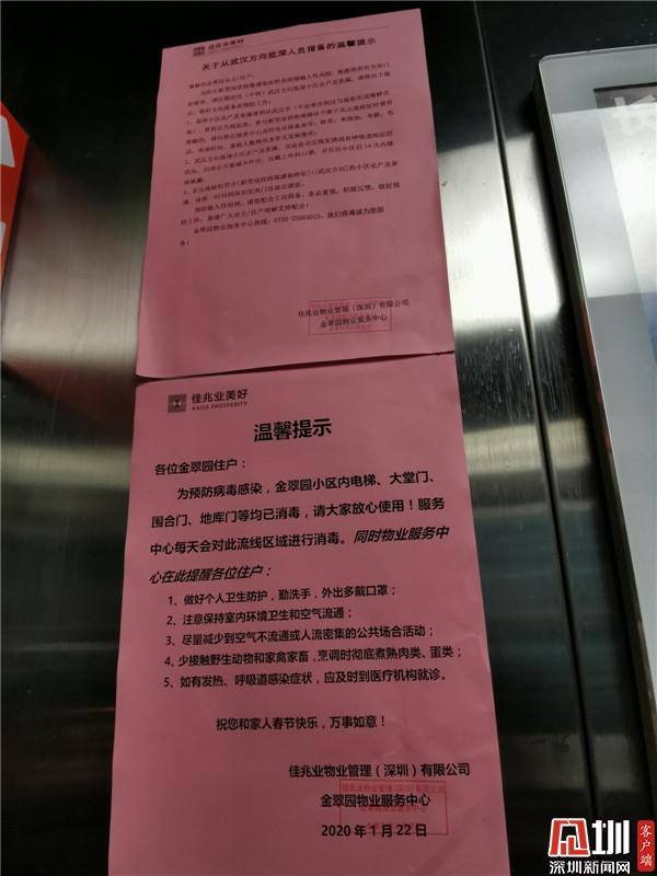小區(qū)物業(yè)管理處主任鄒菊彬表示,目前小區(qū)每天進(jìn)行3次全面消殺,包括地面、電梯、樓道等多個(gè)位置。他表示,小區(qū)內(nèi)已張貼《新型冠狀病毒感染的肺炎相關(guān)知識(shí)和個(gè)人防護(hù)》等防護(hù)指引和宣傳資料。物業(yè)工作人員向還未返深的住戶進(jìn)行了宣傳解釋,消除恐慌。對(duì)返深的小區(qū)住戶已做好詳細(xì)信息登記,對(duì)居家醫(yī)學(xué)觀察的住戶每天兩次隨訪,并經(jīng)常給他們送一些生活用品?!拔覀兊墓ぷ魅藛T已經(jīng)把電話留給他們,有啥需要幫忙的可以隨時(shí)聯(lián)系”,他說到。
