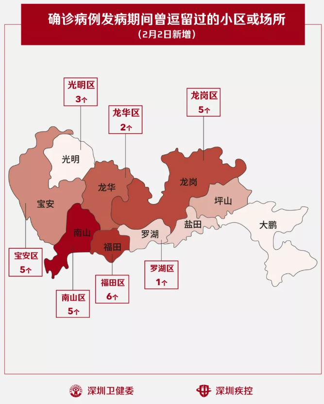 2月2日,疾控專業(yè)人員通過最新的流行病學(xué)調(diào)查確認(rèn),深圳新增27個(gè)小區(qū)(場所),有新確診的病人在出現(xiàn)病征期間曾經(jīng)逗留。