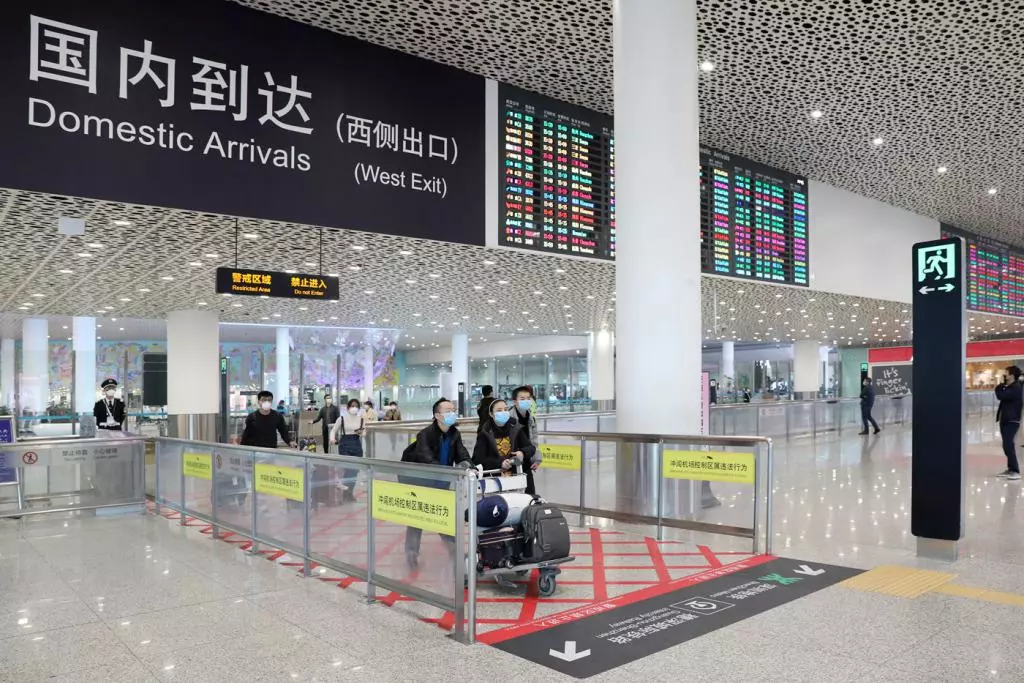 通過(guò)體溫檢測(cè)后,旅客走出機(jī)場(chǎng)出站口。