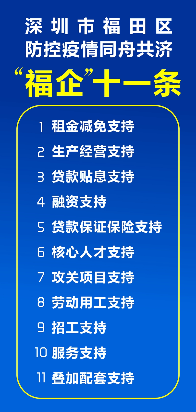 據(jù)福田區(qū)相關(guān)負(fù)責(zé)人介紹,“福企”11條是以“火線”方式誕生的,相關(guān)產(chǎn)業(yè)部門按照區(qū)委區(qū)政府的要求,早謀劃、早行動,短短4天,密集調(diào)研企業(yè)、行業(yè)協(xié)會,加班加點,聚焦企業(yè)存在的突出問題,急企業(yè)所急、想企業(yè)所想,推出了一份有擔(dān)當(dāng)、有分量、有溫度、有針對性的政策。主要特點有: