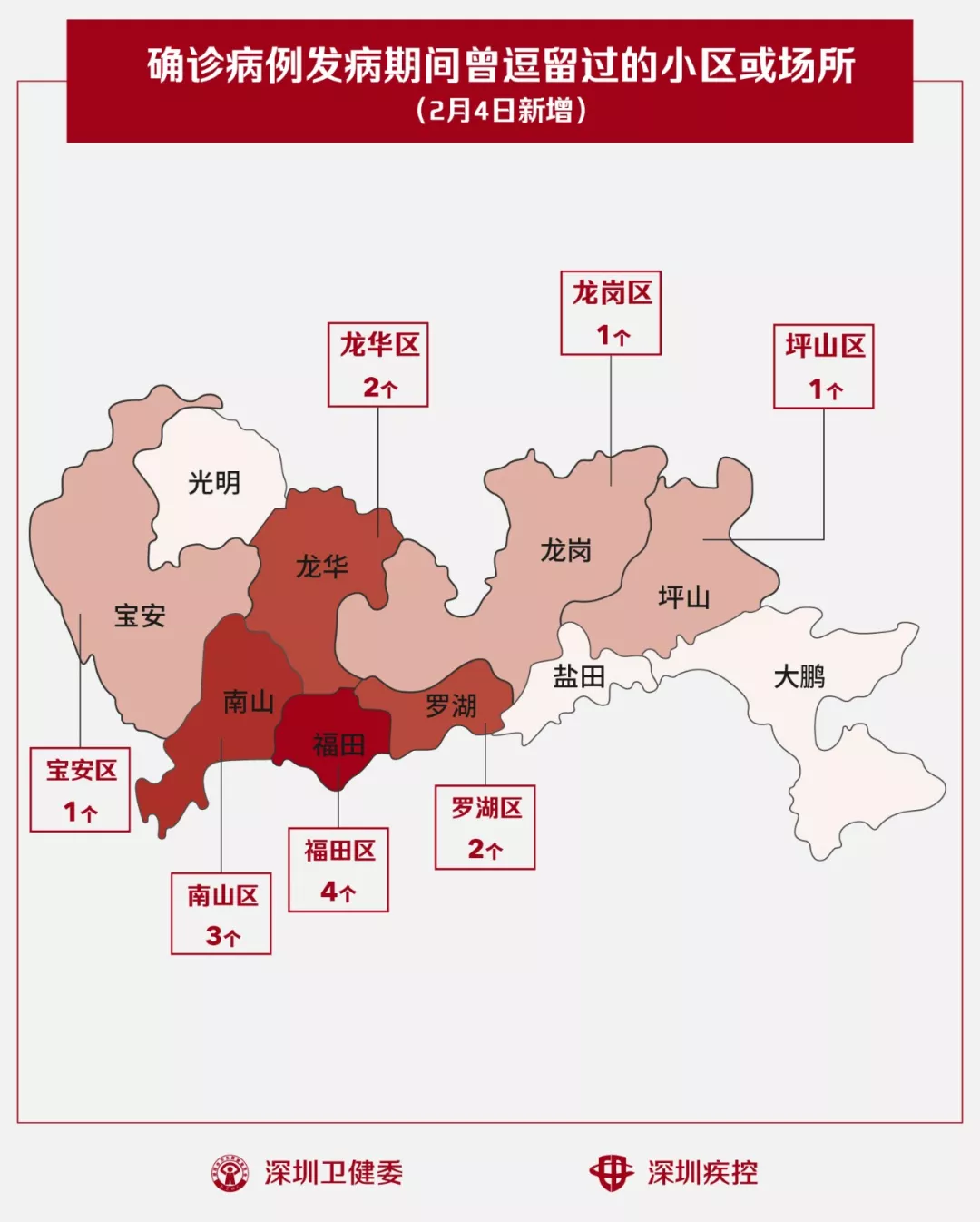 2月4日,疾控專業(yè)人員通過最新的流行病學(xué)調(diào)查確認(rèn),深圳新增14個(gè)小區(qū)(場(chǎng)所),有新確診的病人在出現(xiàn)病征期間曾經(jīng)逗留。