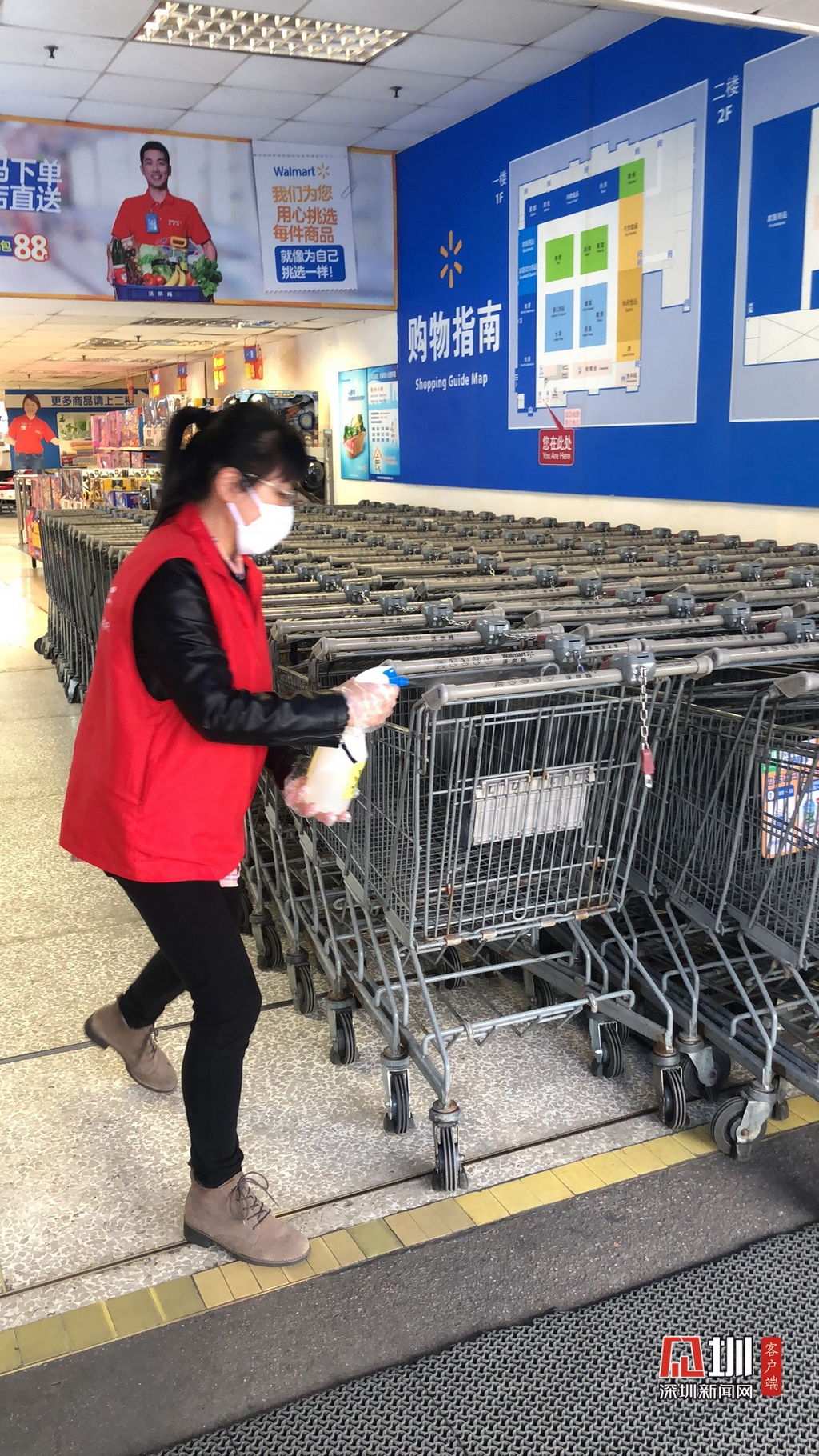 在消毒方面,景田北沃爾瑪超市每天對超市進行高頻次消毒,包括購物車、按鍵、門把手、出入口等人群經(jīng)常接觸的區(qū)域,并保持場所通風,增加空氣對流。