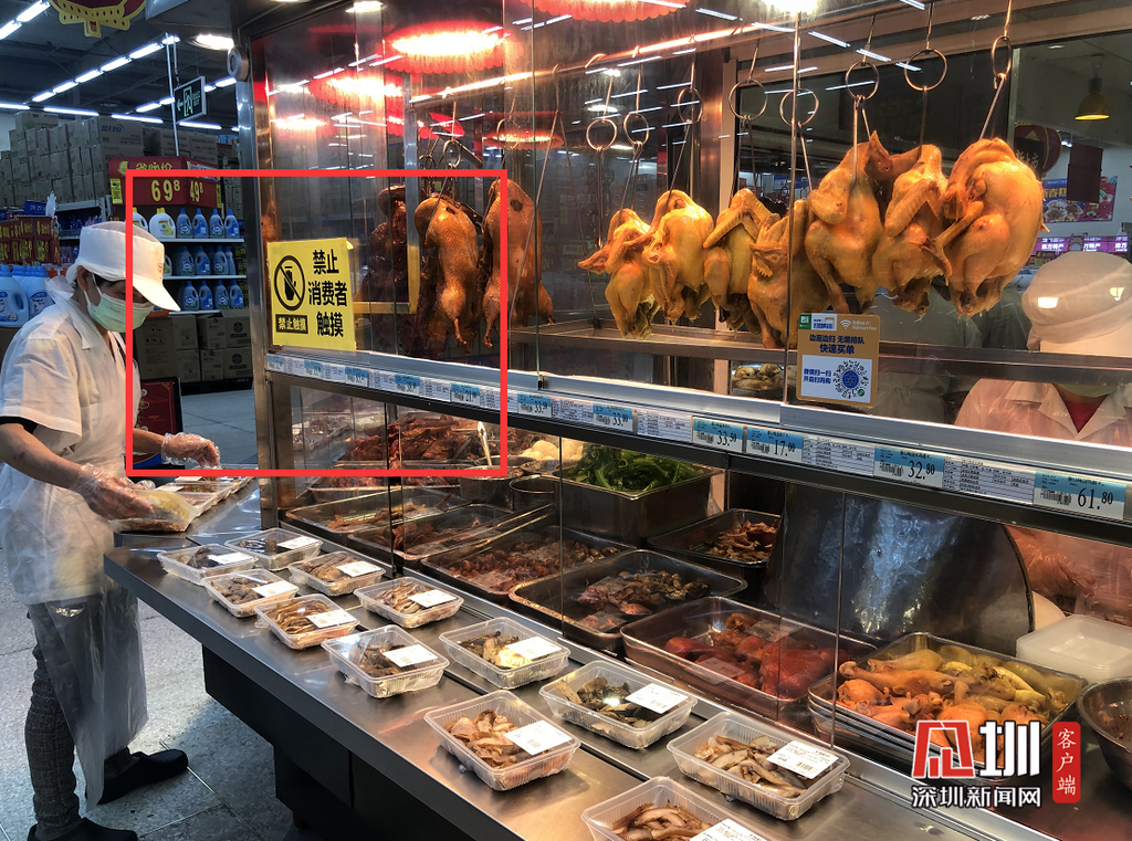 《公告》中提到,禁止商場、超市、糕點店、水果店提供食品“試吃”服務。記者看到,景田北沃爾瑪超市熟食區(qū)有明顯禁止消費者觸摸等標志?!耙咔榉揽仄陂g,我們是禁止給市民提供試吃的?!蔽譅柆斚嚓P(guān)負責人說道。