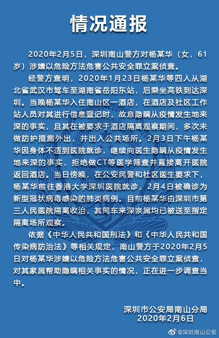 依據《中華人民共和國刑法》和《中華人民共和國傳染病防治法》等相關規(guī)定,南山警方于2020年2月5日對楊某華涉嫌以危險方法危害公共安全罪立案偵查,對其家屬幫助隱瞞相關事實的情況,正在進一步調查中。