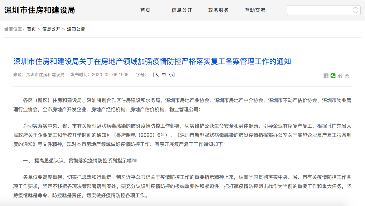 見圳客戶端·深圳新聞網(wǎng)2020年2月6日訊(見圳客戶端、深圳新聞網(wǎng)記者 潘潤華 通訊員 雷湘君)2月6日,深圳市住建局在其官網(wǎng)發(fā)布通知指出,在全省啟動重大突發(fā)公共衛(wèi)生事件一級響應(yīng)期間,暫停房地產(chǎn)項(xiàng)目現(xiàn)場開盤活動,暫停房地產(chǎn)中介線下帶看房活動(企業(yè)自持物業(yè)出租除外),暫停疫情重點(diǎn)地區(qū)現(xiàn)場評估業(yè)務(wù)活動。此外,各物業(yè)管理公司應(yīng)加強(qiáng)人員管理,暫停經(jīng)紀(jì)人員帶客進(jìn)入小區(qū)看房活動。具體恢復(fù)時間另行通知。