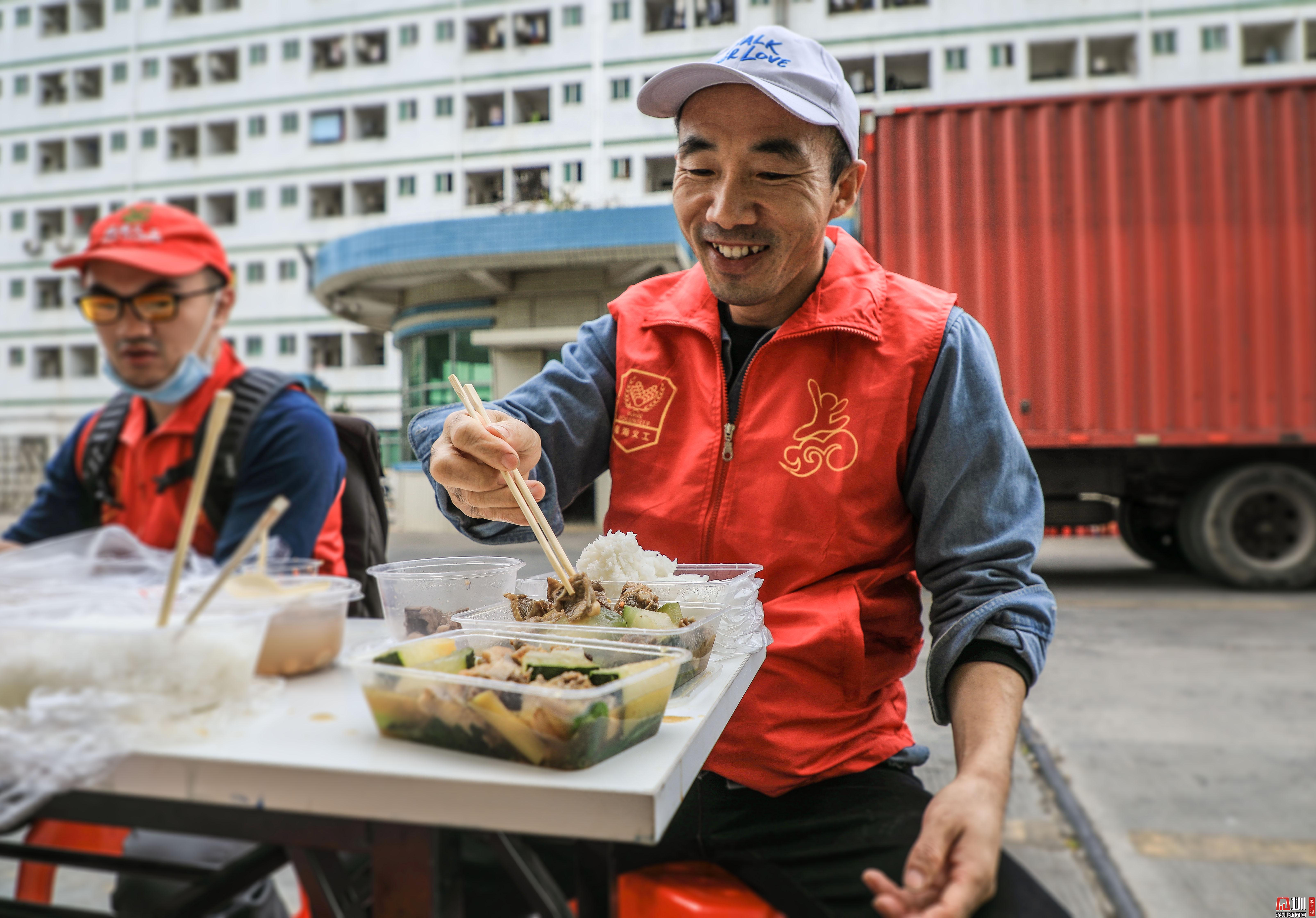 擺好桌子后,郭建庚便去排隊(duì)為義工們領(lǐng)來(lái)午餐,在工廠門(mén)口負(fù)責(zé)幫忙招工的兩位義工不能離崗,郭建庚便把午餐另外給他們送了過(guò)去。