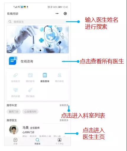 方式一:通過“找醫(yī)生”界面查找醫(yī)生,發(fā)起問診咨詢: