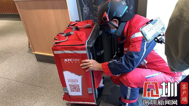 集體用餐配送服務(wù)平臺的餐飲企業(yè)——肯德基,外賣小哥每次送餐后均對外賣柜子進(jìn)行消毒。