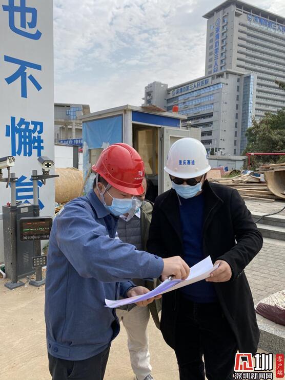 龍海波(左一)在“深圳版火神山”——市第三人民醫(yī)院二期工程臨時(shí)院區(qū)項(xiàng)目現(xiàn)場(chǎng)勘察供電線(xiàn)路。(蕭新敏 攝)
