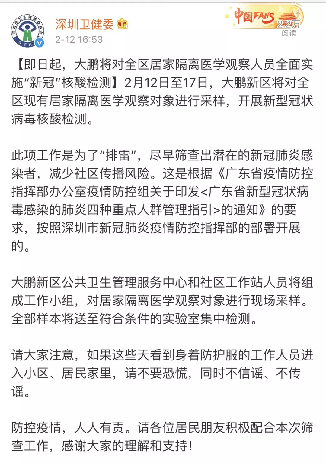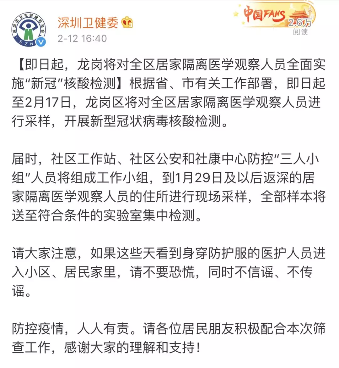 為防范新冠病毒感染疫情的社區(qū)傳播,切實做到早發(fā)現(xiàn)、早隔離、早診斷、早治療,2月12日起,深圳各區(qū)(新區(qū))均為所有居家隔離醫(yī)學觀察人員檢測新型冠狀病毒核酸。