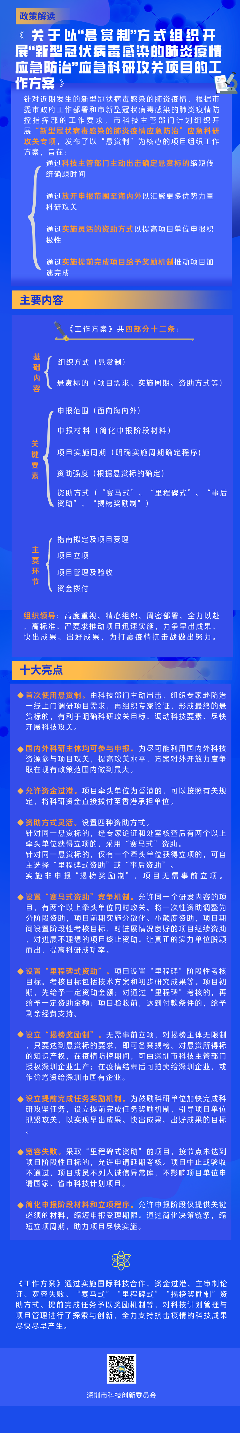 見圳客戶端·深圳新聞網(wǎng)2020年2月13日訊(見圳客戶端、深圳新聞網(wǎng)記者 金洪竹)2月12日,深圳市科創(chuàng)委發(fā)布以“懸賞制”為核心的“新型冠狀病毒感染的肺炎疫情應(yīng)急防治”應(yīng)急科研攻關(guān)專項組織工作方案。該方案旨在通過科技主管部門主動出擊、確定懸賞標的來縮短傳統(tǒng)科研項目確題時間,匯聚更多優(yōu)勢力量科研攻關(guān),提高項目單位申報積極性,從而推動抗疫項目加速完成。