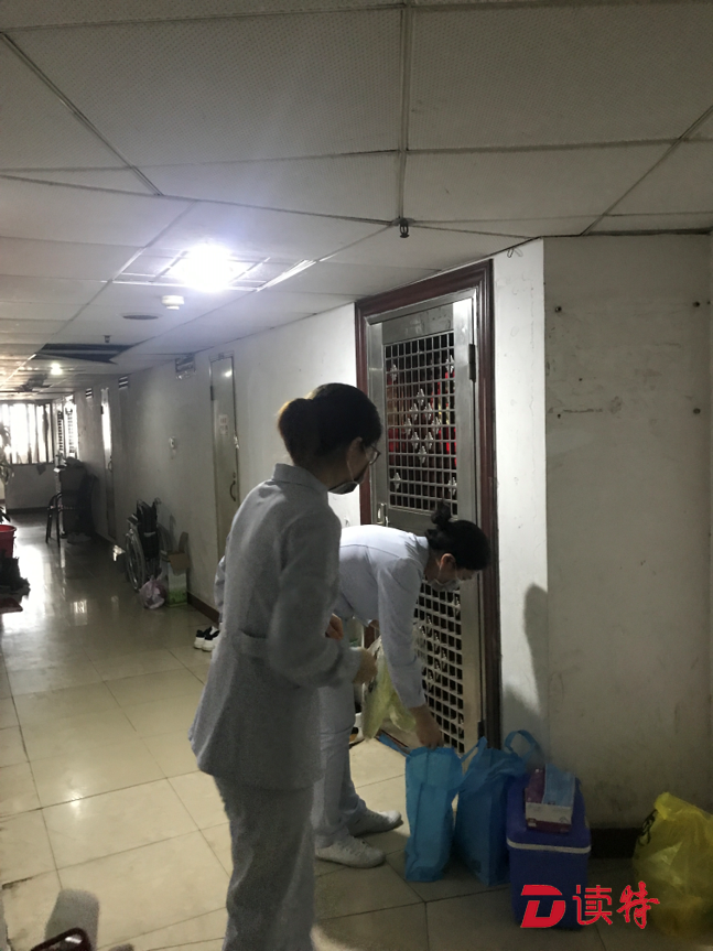 孫女士打開門,將工作人員遞進(jìn)去的防護(hù)裝備穿戴完畢?!盀榱吮Wo(hù)醫(yī)護(hù)人員的安全,減少交叉感染的可能性,所有的上門檢測都會(huì)在樓道里進(jìn)行?!鄙缈抵行墓ぷ魅藛T說。提前穿好防隔服等防護(hù)裝備、拿檢測時(shí)給居民坐的凳子、為凳子消毒,開始進(jìn)行檢測前就需要做很細(xì)致的準(zhǔn)備工作。