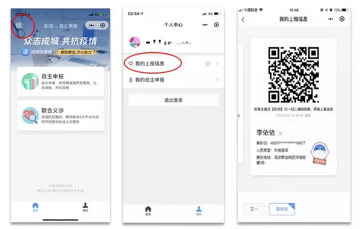 在進(jìn)出小區(qū)時(shí),可在“深i您-自主申報(bào)”小程序首頁點(diǎn)擊左上角“二維碼圖標(biāo)”或前往“我的>個(gè)人中心”點(diǎn)擊“我的上報(bào)信息”向工作人員出示“深i您-自主申報(bào)”平臺(tái)生成的系統(tǒng)認(rèn)證圖碼,憑該圖碼出入小區(qū),無需作重復(fù)申報(bào)。