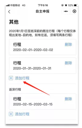 答:屬于返深人員,需要自主申報(bào)。返深人員必須填報(bào)2020年1月1日后離深的既往全部行程。如有多段行程,請(qǐng)?jiān)谔顖?bào)了第一條行程后,點(diǎn)擊“添加行程”或“添加下一條”按鈕,保存當(dāng)前行程并繼續(xù)添加下一條行程。您這種情況需填報(bào)3條行程記錄,分別是:深圳-黃山、黃山-東莞、東莞-深圳。