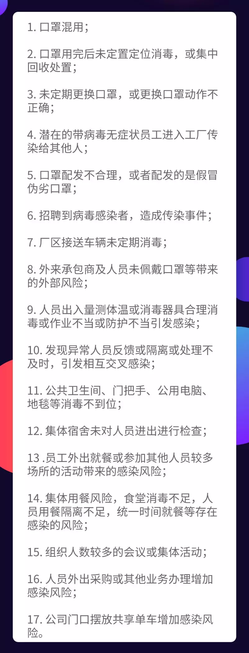 疫情防控和節(jié)后復產(chǎn)復工給企業(yè)安全生產(chǎn)帶來新挑戰(zhàn),如何做好防控措施?哪些風險又要防范?員工又如何自我保護?
