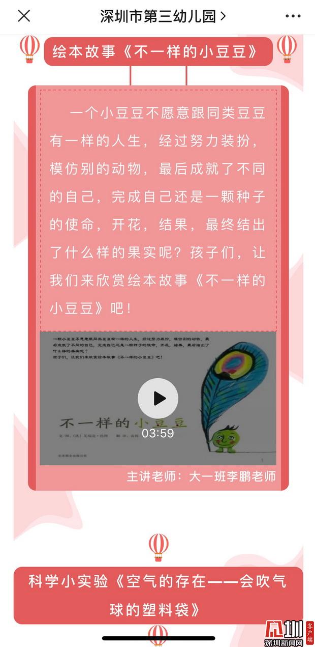 深圳市第三幼兒園園長邱雪華訴記者:“目前,三幼已經(jīng)開啟線上教學(xué)活動,我們充分運用公眾號、微信群等網(wǎng)絡(luò)平臺,與家長、幼兒充分互動,陸續(xù)推出具有健康促進(jìn)特色的圖文推送,其中包括介紹防疫常識的攻略、由園長主講的園長電臺,還創(chuàng)辦了每日一期的原創(chuàng)系列游戲,以便家長在家也能獲取適宜的親子游戲活動資源?!庇浾咴谏钲谑械谌變簣@的微信公眾平臺上看到,幼兒園線上互動內(nèi)容豐富,其中包括視頻繪本故事、科學(xué)小實驗以及親子體育游戲。每個版塊均由深圳市第三幼兒園老師們主講示范并錄制視頻,便于孩子及家長學(xué)習(xí)。