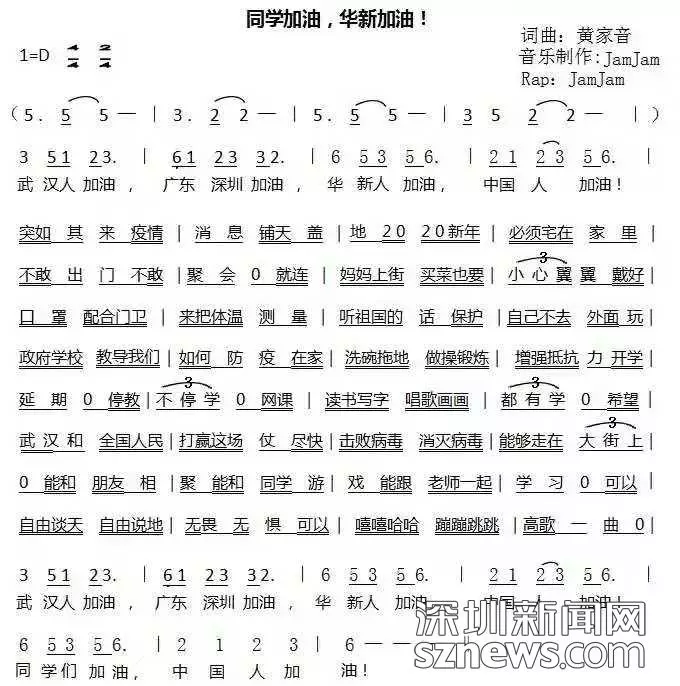 開學首日,深圳市福田區(qū)華新小學音樂教師黃家音作詞作曲《同學加油華新加油》祝福武漢,叮囑同學。