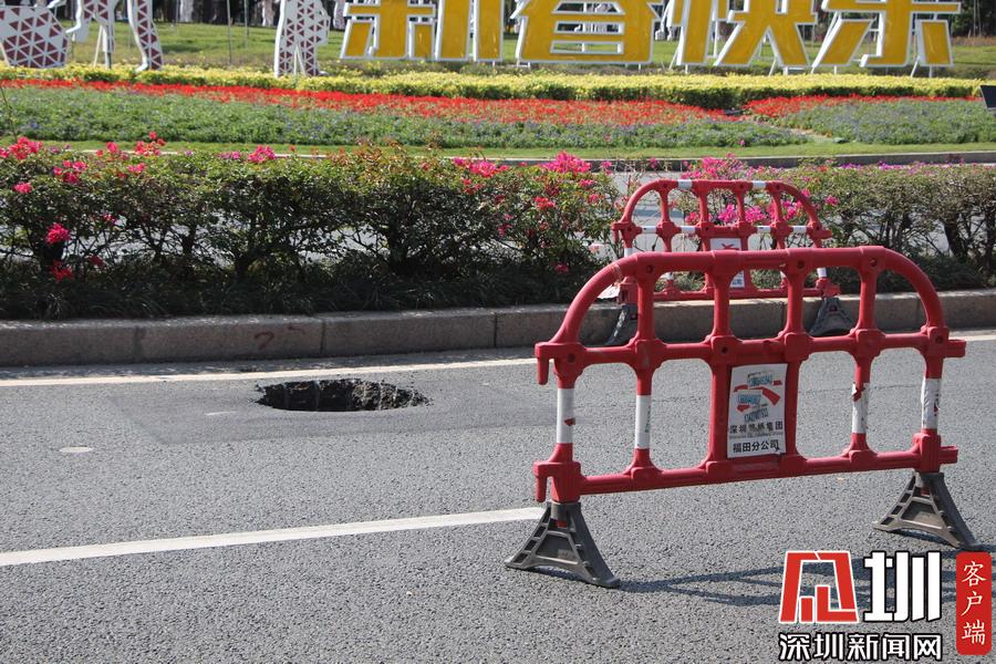 據(jù)市交通運(yùn)輸局福田管理局的蔡警官介紹,18日上午9點(diǎn)40分,他在福田區(qū)深南大道輔導(dǎo)市民廣場(chǎng)路段例行巡邏時(shí),發(fā)現(xiàn)路面有一塌陷的坑口,立即向上級(jí)匯報(bào),并用鐵馬將洞口圍起來?!按蟾攀宸昼姾?,各個(gè)負(fù)責(zé)部門的工作人員就陸續(xù)到場(chǎng)了,期間也沒有造成什么交通意外?!?/span>