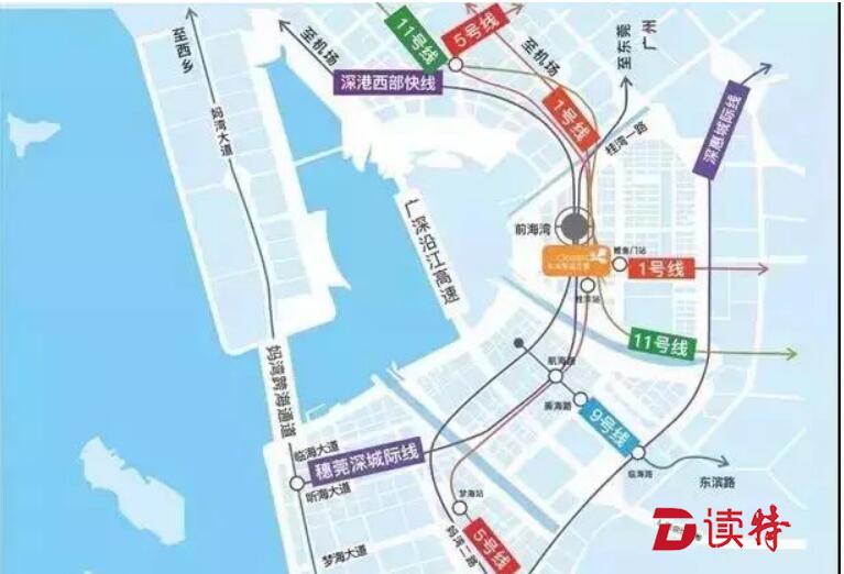 樞紐部分由地下5條軌道線路及口岸和公交、出租、旅游大巴等交通接駁場站構成??傆玫孛娣e約20公頃。前海綜合交通樞紐由政府投資,深圳地鐵集團建設。項目分為近期和遠期兩部分實施。預計2020年完成這項交通巨制的地下土建。目前地鐵1、5、11號線前海灣站已經(jīng)開通,穗莞深城際線預計年內將開工,港深西部快線正在規(guī)劃中。