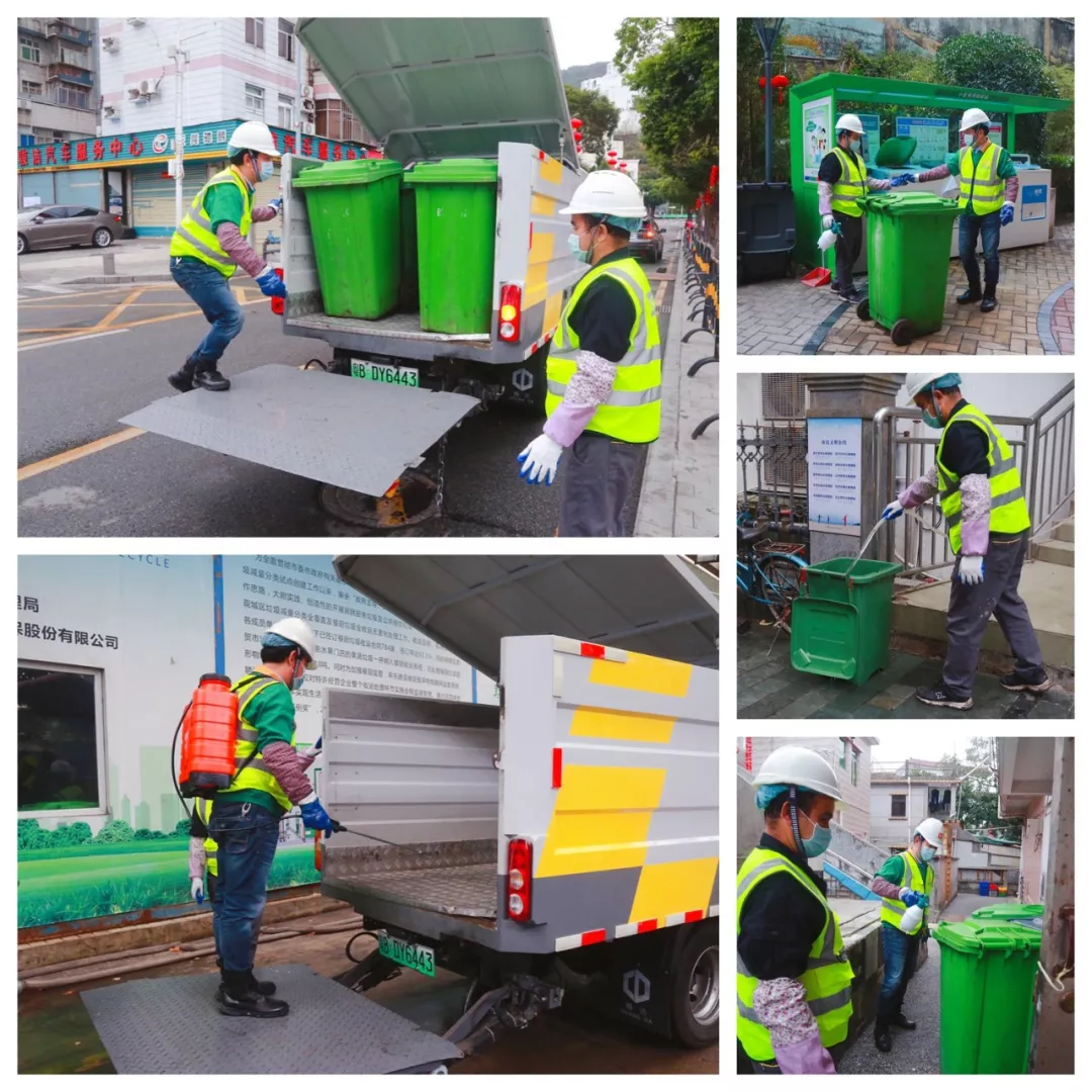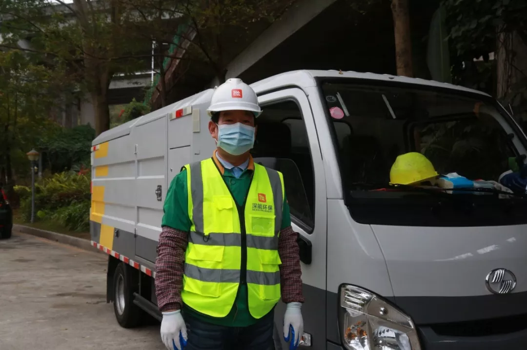 上午7點(diǎn)半,第一個(gè)到崗的田夫珍開(kāi)始測(cè)量體溫,消毒后穿上印有“深能環(huán)?!钡鸟R甲,戴上安全帽,檢查車輛消殺情況。8點(diǎn)整,他和14名同事一起出發(fā),分赴鹽田7條線路,開(kāi)始和餐廚垃圾打交道。