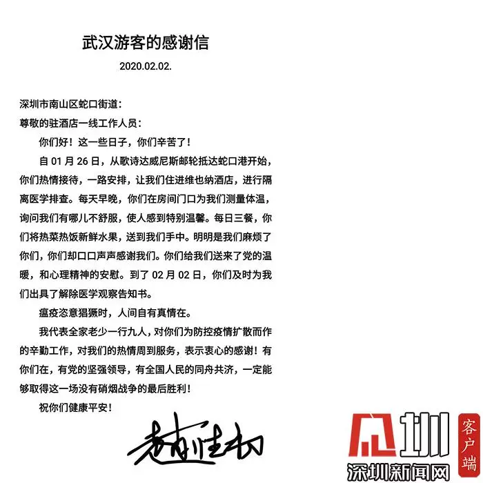 ▲威尼斯郵輪解除醫(yī)學(xué)觀察乘客趙性初的感謝信