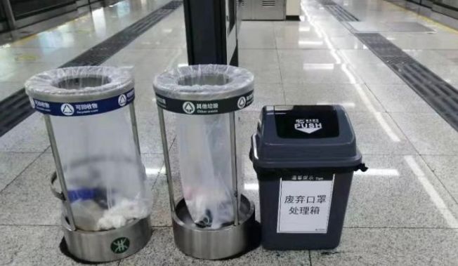 深圳地鐵設(shè)置廢棄口罩回收桶,在所轄7條線路的200多個(gè)車站共投放547個(gè)專用垃圾桶,用于回收廢棄口罩等各類防護(hù)用品。