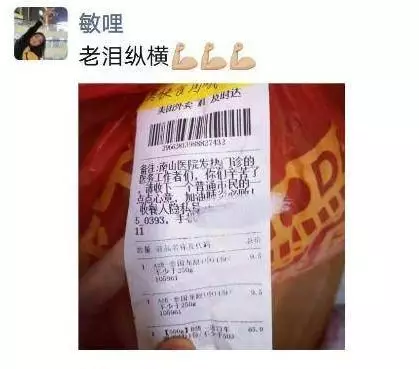 1月30日晚上8點(diǎn)56分,華中科技大學(xué)協(xié)和深圳醫(yī)院(南山醫(yī)院)手外科護(hù)士王敏在朋友圈曬了一張照片,照片里是一個(gè)紅色塑料袋上貼著一張外賣單,備注上寫著,“南山醫(yī)院發(fā)熱門診的醫(yī)務(wù)工作者們,你們辛苦了!請收下一個(gè)普通市民的一點(diǎn)點(diǎn)心意,加油,肺炎必?cái)?!?/p>