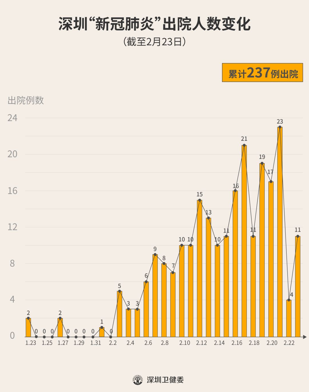 2月23日下午,經(jīng)專(zhuān)家組會(huì)診,深圳有11名新型冠狀病毒肺炎確診患者出院,累計(jì)達(dá)237人,連續(xù)21天有人出院。