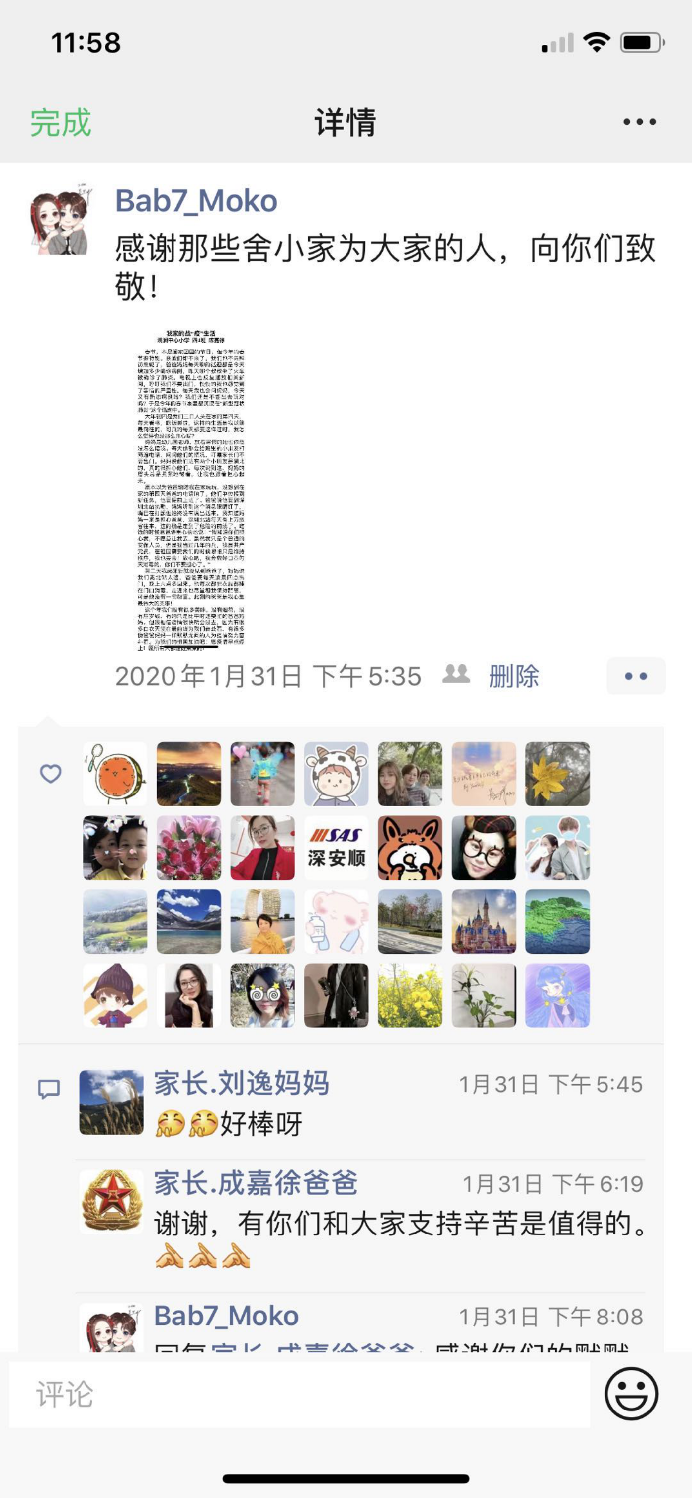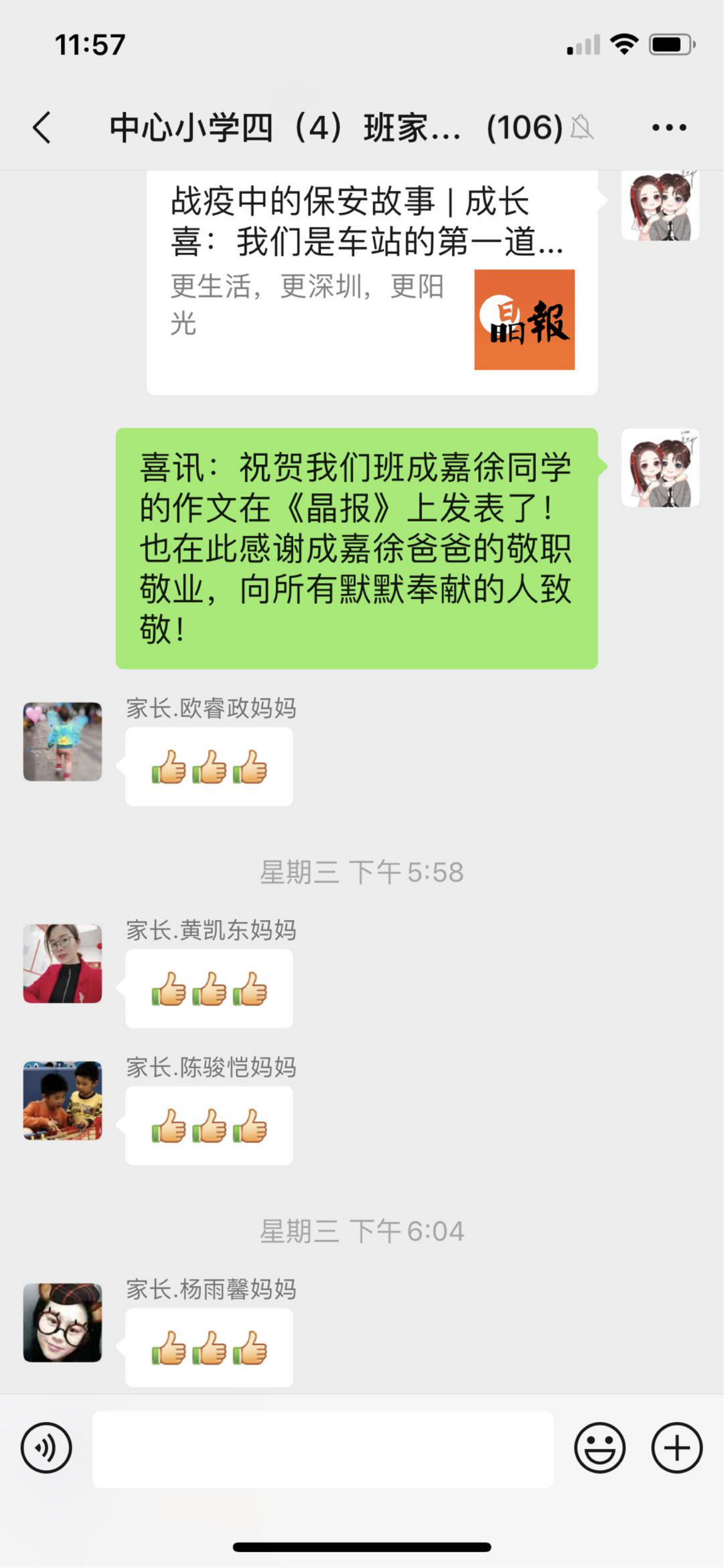 莫老師在班級群和朋友圈里分享學生發(fā)表的作文。