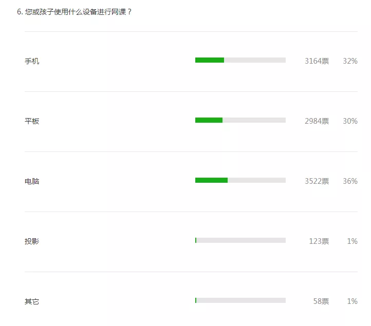 是否擁有相應(yīng)的電子設(shè)備和良好的網(wǎng)絡(luò)是保障網(wǎng)課順利進行的基礎(chǔ)。調(diào)查結(jié)果顯示,超過98%的參與者使用手機、平板或電腦進行網(wǎng)課。也有8%的調(diào)查者曾遇到?jīng)]有設(shè)備的問題。