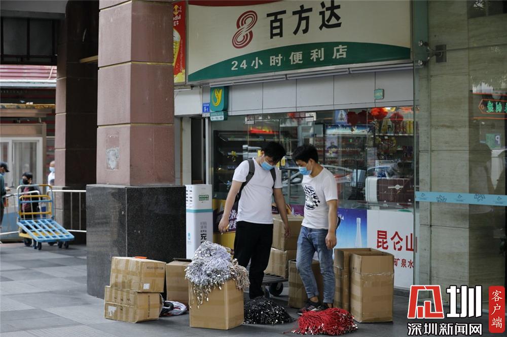 華強北龍勝配件城附近,搬運貨物的人均有佩戴口罩。