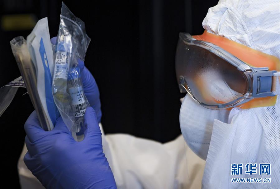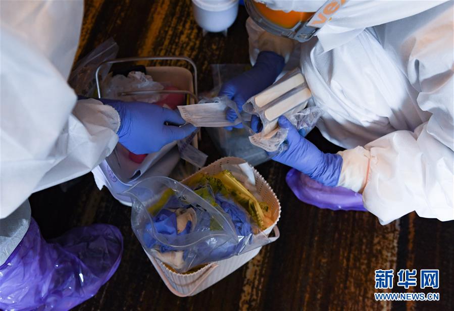 2月27日,在深圳龍崗的一家“健康驛站”,工作人員進(jìn)行咽拭子采集前的準(zhǔn)備。 新華社記者 毛思倩 攝