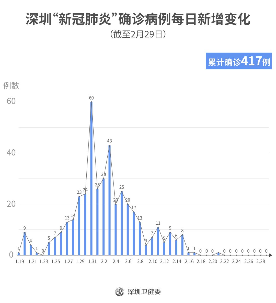 截至2月29日24時,深圳累計報告“新冠肺炎”確診病例417例。2月29日當(dāng)天全市無新增確診病例,當(dāng)天出院病例9例(從26日起不再公布出院個案)。