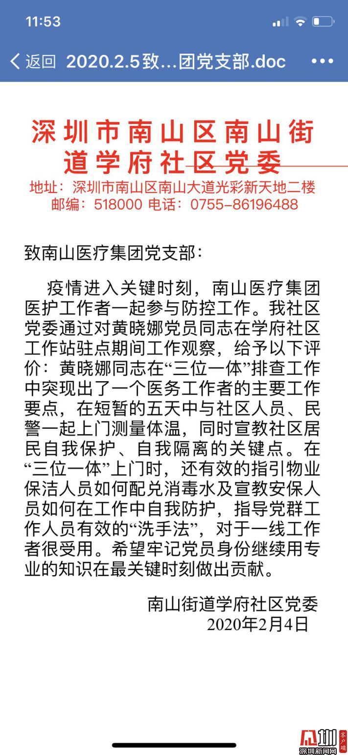 南山區(qū)南山街道學(xué)府社區(qū)黨委對黃曉娜的表揚信