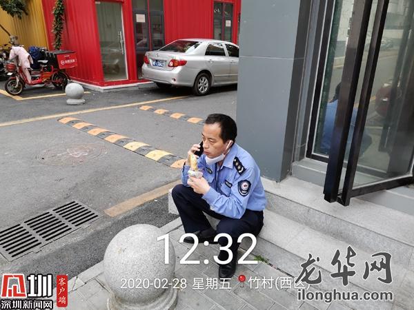 做完返深隔離人員沿途消殺工作,早已錯(cuò)過飯點(diǎn),記掛著接下來的種種工作,他轉(zhuǎn)身去便利店買了個(gè)面包,坐在店門口的臺階上,隨便對付一下。簡單潦草的一頓午餐,卻是他難得的歇息片刻。