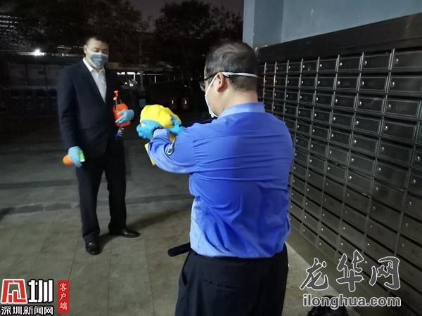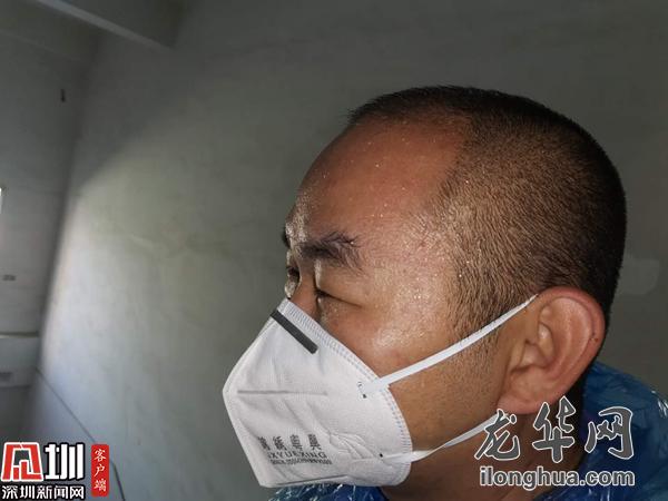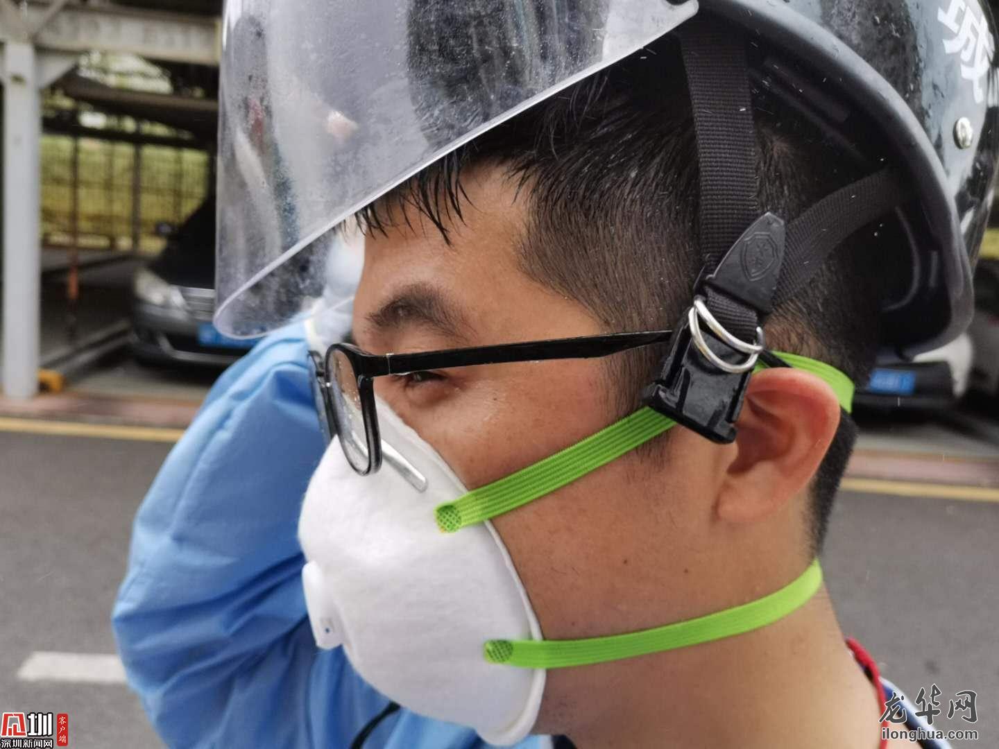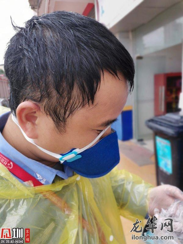 接到有返深人員的通知,他立刻帶隊(duì)趕往現(xiàn)場,多次測溫后仍體溫偏高,他不放心地叫來三位一體人員,一番確認(rèn)之后,將發(fā)熱人員送往醫(yī)院,他則獨(dú)自善后對樓道進(jìn)行消毒,將近兩個(gè)小時(shí)的折騰,他終于得以到垃圾桶旁邊喘口氣。額頭勒出的印痕和黏在后背的制服,都是每一天的勛章。