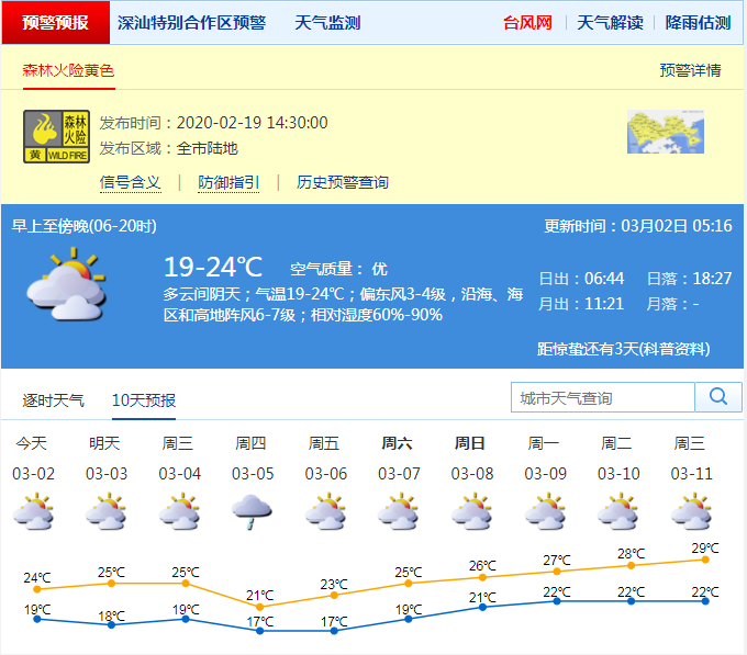 見圳客戶端·深圳新聞網(wǎng)2020年3月2日訊 深圳市氣象臺預(yù)計,3月2日深圳多云,有零星小雨,氣溫19-24℃,東北風3-4級,沿海、海區(qū)和高地陣風6-7級;3日多云間陰天,有零星小雨;4日多云間陰天有小雨;5-6日陰天到多云有小雨或零星小雨,氣溫略微下降;7-9日多云,氣溫逐日回升。