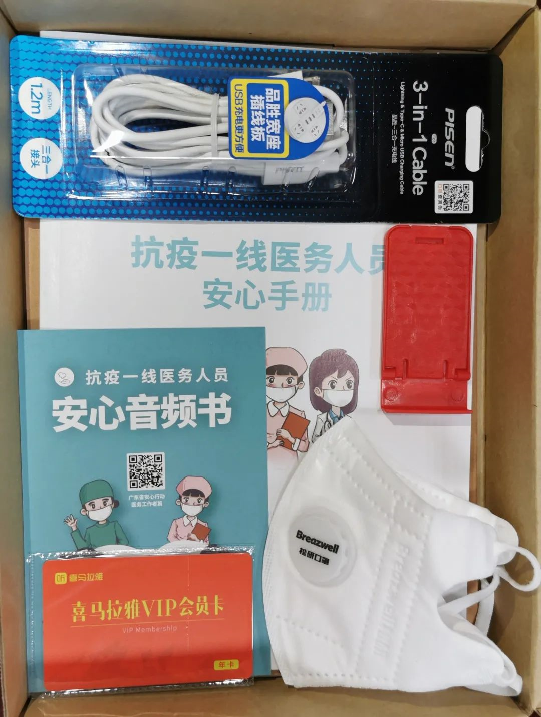 這是一個20x28cm2的普通牛皮紙紙盒,里面最顯眼的,是一本《安心手冊》,一張“抗疫一線醫(yī)務(wù)人員安心音頻書”卡,一張音頻APP的有聲書卡,和兩個N95口罩。此外,筆記本、筆、手機(jī)充電線、手機(jī)支架,也都細(xì)心地配全了。紙盒旁還放著一個小巧玲瓏的智能聲控音箱,使用者“不沾手”就能使用,防止病毒傳播。小東西里,也藏著大關(guān)愛。