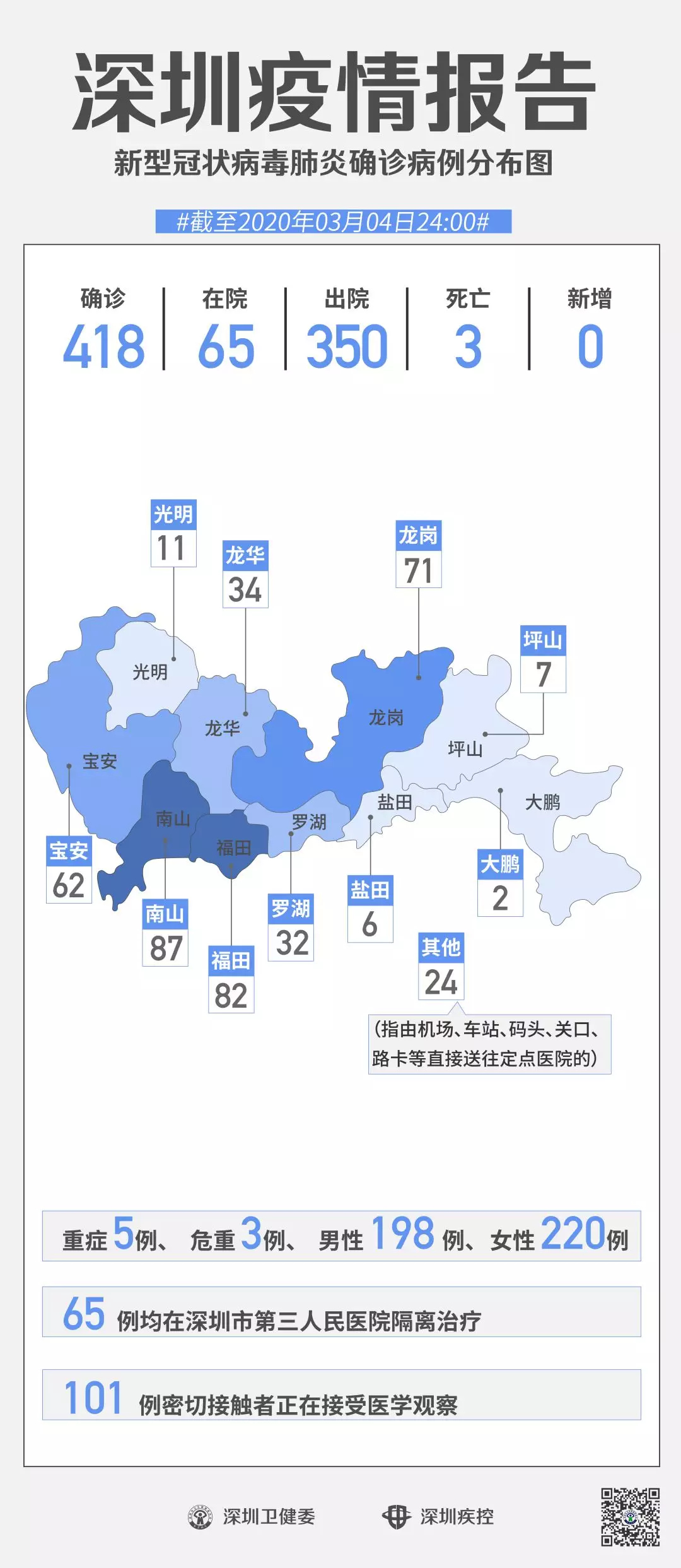 見圳客戶端·深圳新聞網(wǎng)2020年3月5日訊 截至3月4日24時,深圳累計報告“新冠肺炎”確診病例418例。3月4日當(dāng)天全市無新增確診病例,當(dāng)天出院病例9例(從2月26日起不再公布出院個案)。