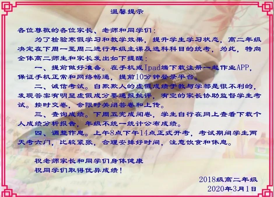 為了提高考試的可信度,考前各班級還進(jìn)行了誠信教育,讓學(xué)生明白誠信考試的重要性以及自欺欺人的危害,并發(fā)動居家的家長積極配合監(jiān)考??记?,學(xué)校也向老師學(xué)生和家長發(fā)了提示,提醒網(wǎng)上考試注意事項。