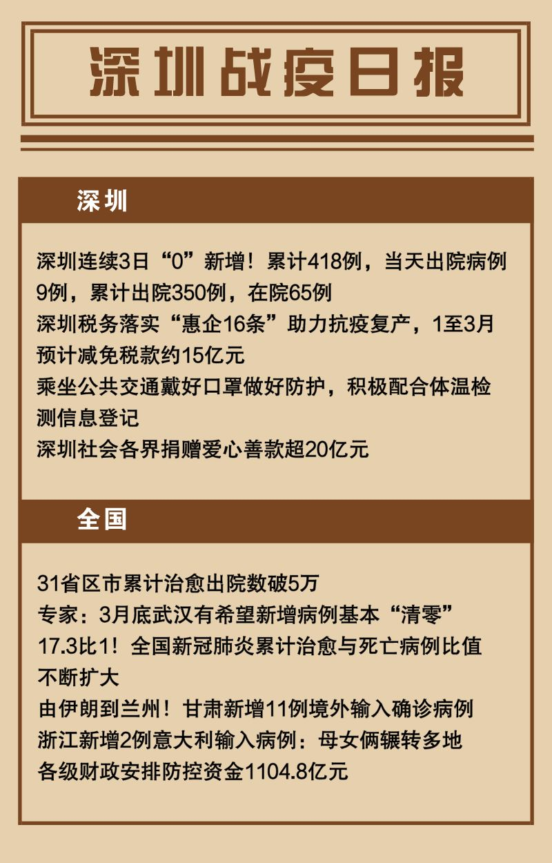 ⑥截至3月4日24時,深圳累計報告“新冠肺炎”確診病例418例。3月4日當(dāng)天全市無新增確診病例,當(dāng)天出院病例9例。目前,重癥5例、危重癥3例,死亡3例,累計出院350例。65例確診病例均在深圳市第三人民醫(yī)院隔離治療。101例密切接觸者正在接受醫(yī)學(xué)觀察。